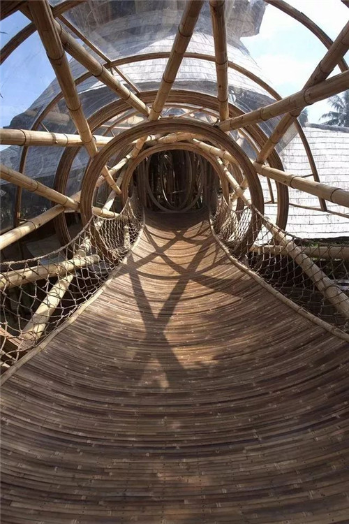 別墅的入口經(jīng)過一個非常具有戲劇性的隧道連橋,之后直接進入到露天起居室及餐廳。戲劇性的空間讓它可以稱得上為一座奇幻主題樂園。